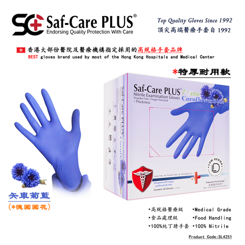 Saf-Care PLUS®全方位護膚*高品質純丁腈手套 (矢車菊藍) (無粉) - 低敏專利技術, 高規格醫療級, 食品處理安全級, AQL1.5 [丁腈手套/即棄手套/一次性手套] (50隻/盒 (3種尺碼選擇))